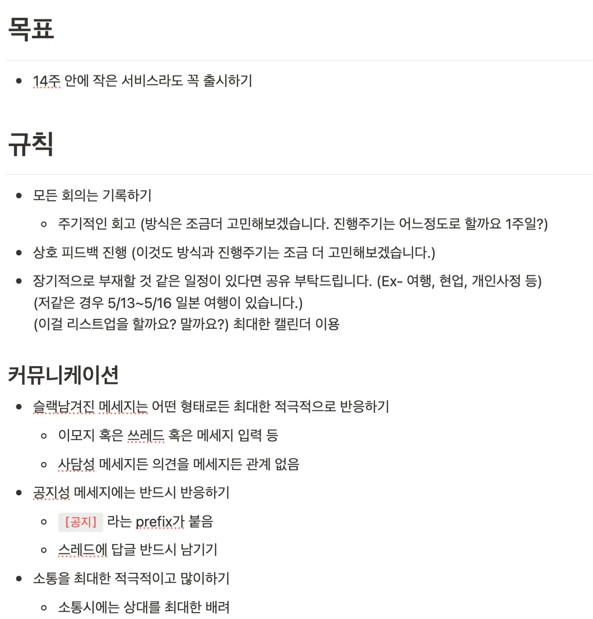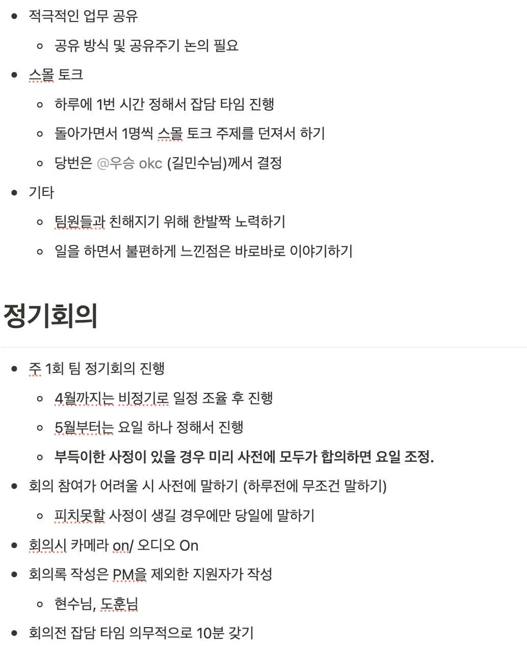 처음 1주차 회의때 화상으로 각자 자기소개를 하며 그라운드 룰을 만들었다. 서먹서먹하고 낯설었지만 다들 의견을 적극적으로 많이 내주시고 조금씩 다가가려고 노력해주셔서 첫 느낌이 되게 좋았다. 얘기를 나누다 보니 팀 내부적으로 지향하는 바가 어느정도 비슷하다는 것을 알게 되었다. 이를 바탕으로 우리만의 그라운드 룰을 세웠다.