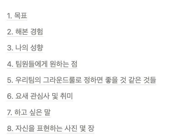 팀이 꾸려진 이후, PM이었던 민수님께서 자기 소개 템플릿을 만들어주셔서 덕분에 수월하게 자기 소개 내용을 채워 넣을 수 있었다. 특히 각자의 성향이나 팀원들에게 바라는 점들을 작성하고 살펴보다보니 팀원분들의 성향을 손쉽게 알 수 있었다.
