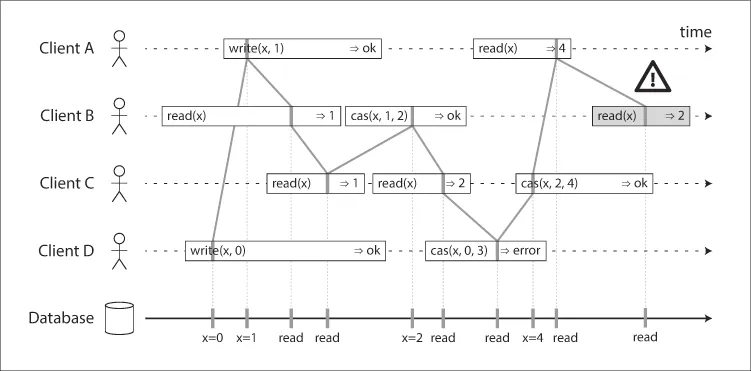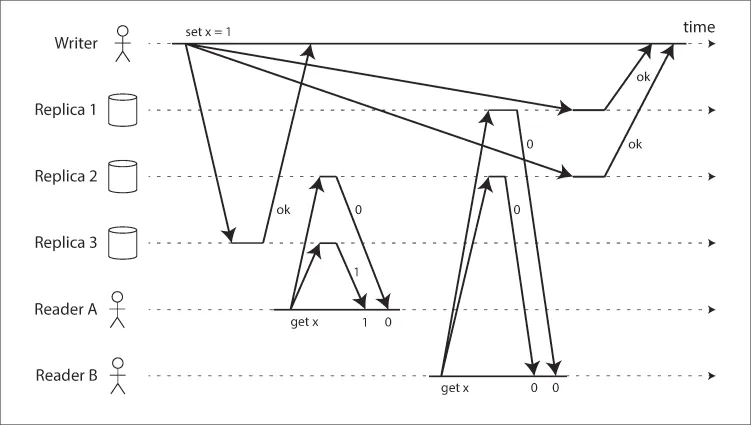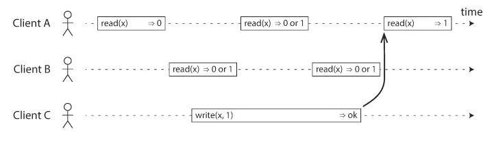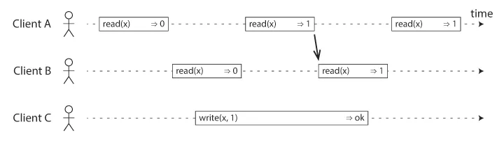 x의 처음 값은 0이고, 클라이언트 C 가 1로 설정하는 쓰기 요청 실행