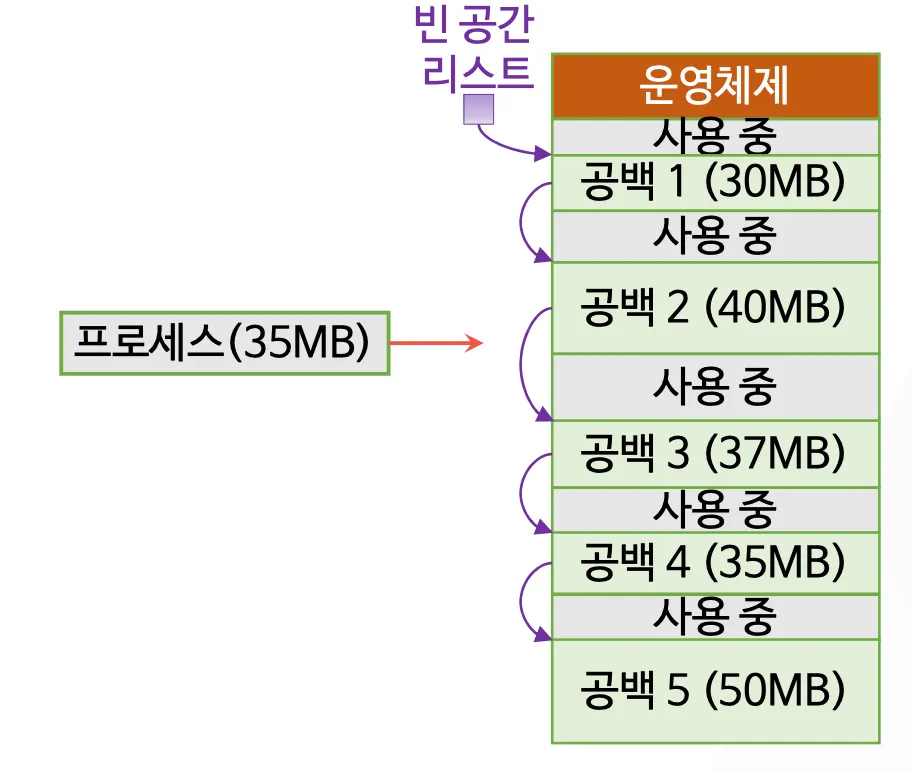 프로세스가 적재 될 수 있는 빈 공간 중에서 가장 먼저 발견되는 곳에 할당