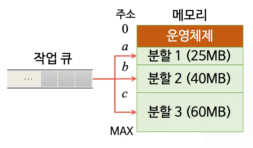 하나의 분할에 하나의 프로세스가 적재되는 방식