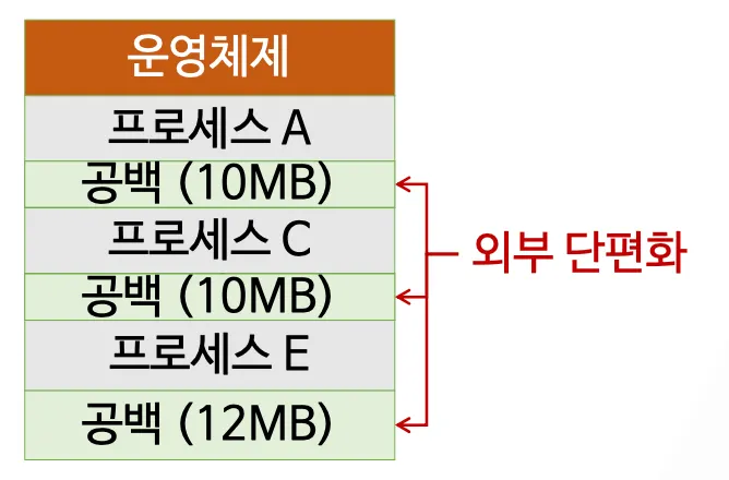 메모리의 할당과 반환이 반복됨에 따라 작은 크기의 공백이 메모리 공간에 흩어져 생김