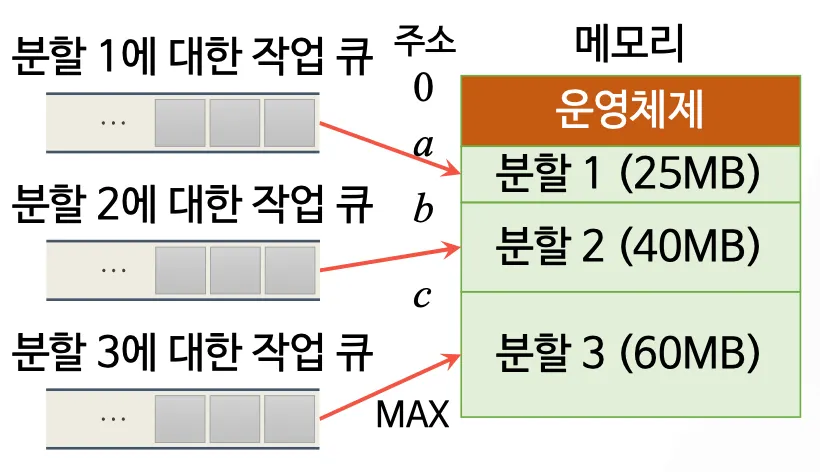 분할 영역마다 큐를 두고 큐에 들어온 프로세스는 해당 분할 영역에만 적재