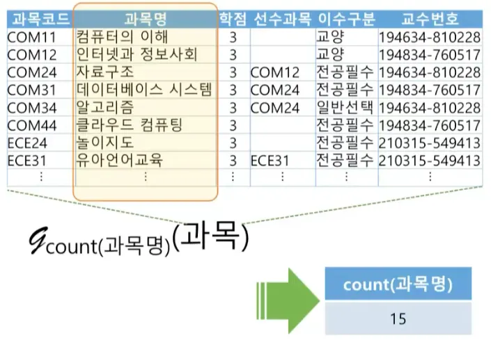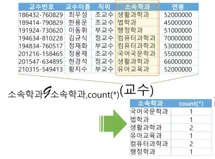 레코드그룹화를 위해 집계 함수 연산자 앞에 그룹화 속성을 기술