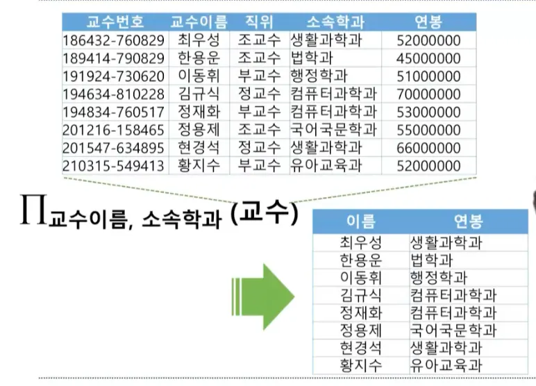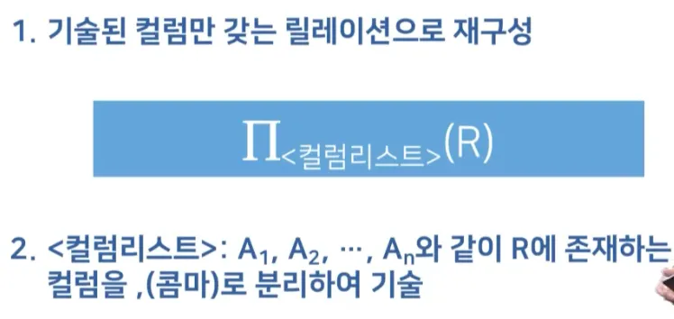 기술된 컬럼만 갖는 릴레이션으로 구성