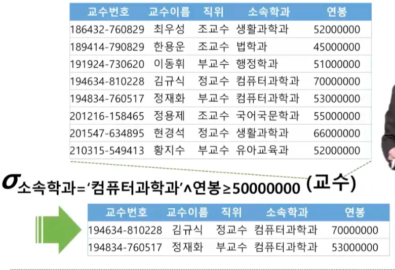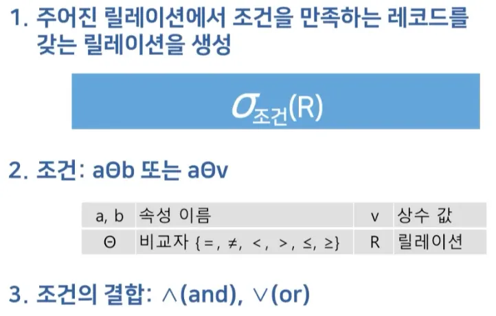 주어진 릴레이션에서 조건을 만족하는 레코드를 갖는 릴레이션을 생성