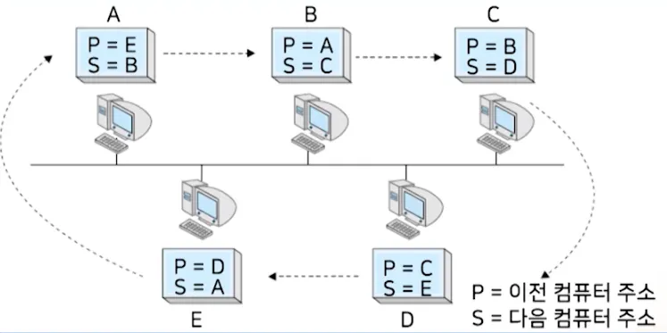 환형 형태의 위상을 가진 네트워크 구성 후 토큰을 가진 노드만 데이터 전송할 수 있도록 하는 제어 방식