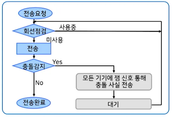 충돌 발생시, 임의의 시간 대기 후 다시 데이터 전송