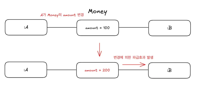 A가 Money의 amount 변경 → 변경에 의한 파급효과 발생