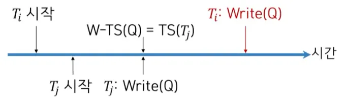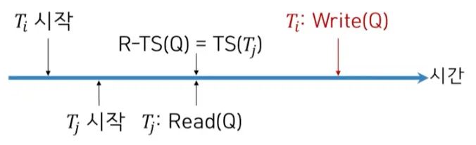 TS(Ti) < R-TS(Q) 이면 Write 연산이 거부되고 Ti는 롤백