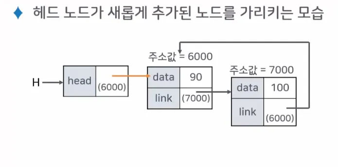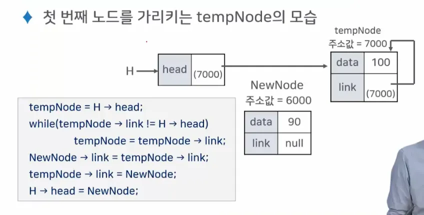 // 원형 리스트 첫번째 노드 삽입 연산, x값은 100이라 가정함