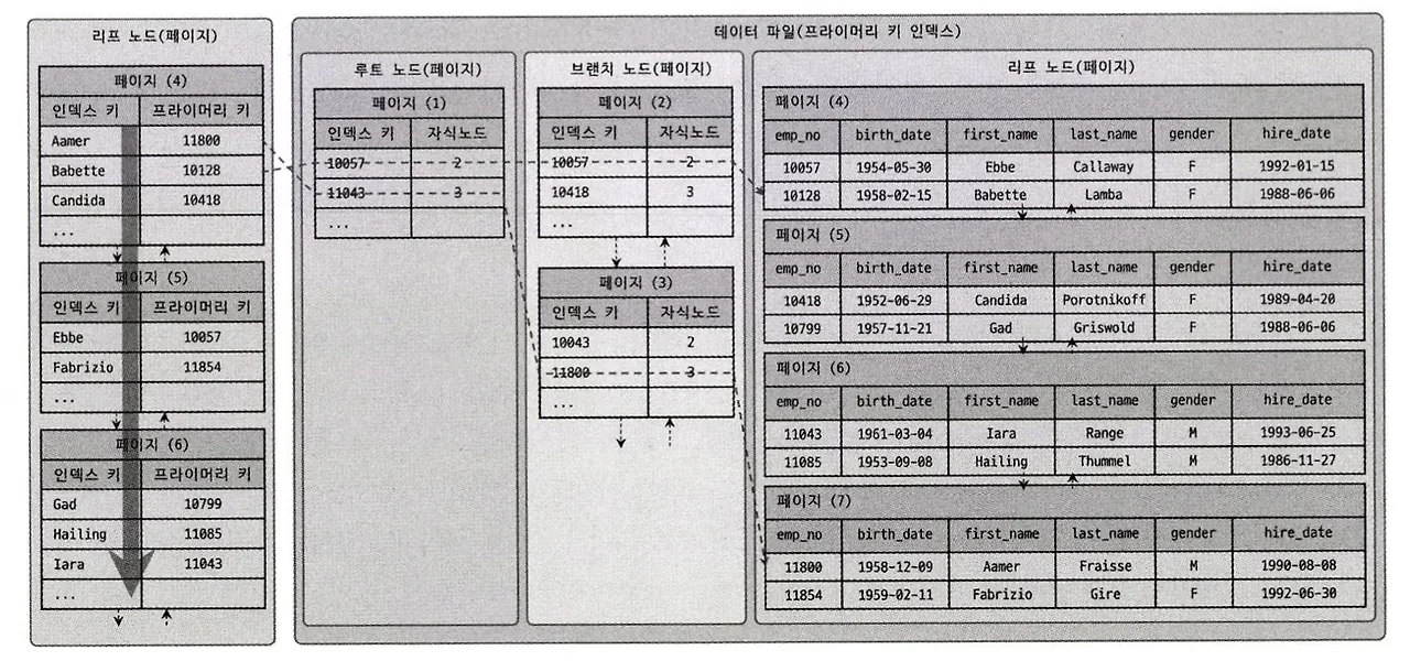 리프 노드에 저장된 프라이머리 키를 검색 → 파라이머리 키 인덱스 검색 → 리프 노드 레코드 조회