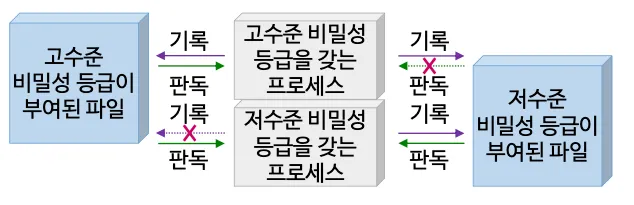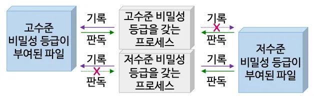 하위 → 상위 보안 수준으로 정보가 흐르는 것을 방지