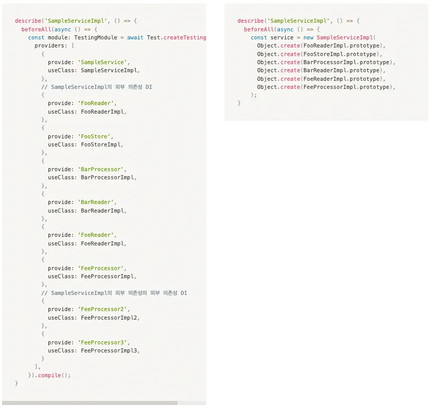 위 클래스의 테스트 코드를 작성하기 위해서는 Jest의 CreateTestingModule 을 활용하여 테스팅 모듈에 클래스 DI를 주입해줘야하는데, SampleServiceImpl 에 주입되는 외부 의존성을 모두 명시적으로 일일이 주입 해줘야만 했다.