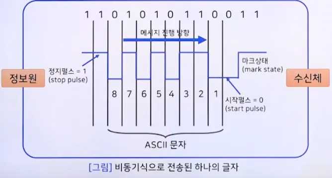 문자의 비트 수와 전송 속도를 알면 정확하게 비트들을 세어서 각 문자를 구성함