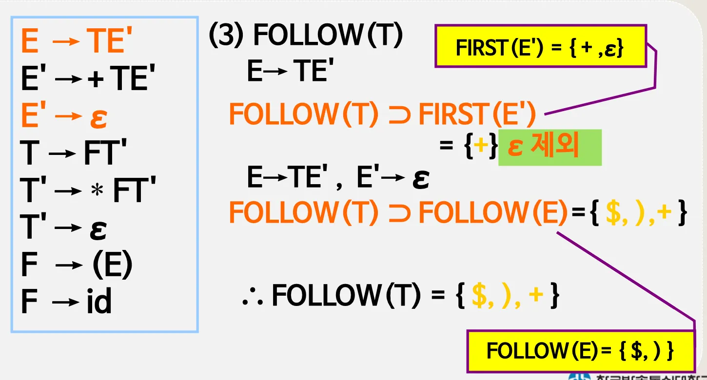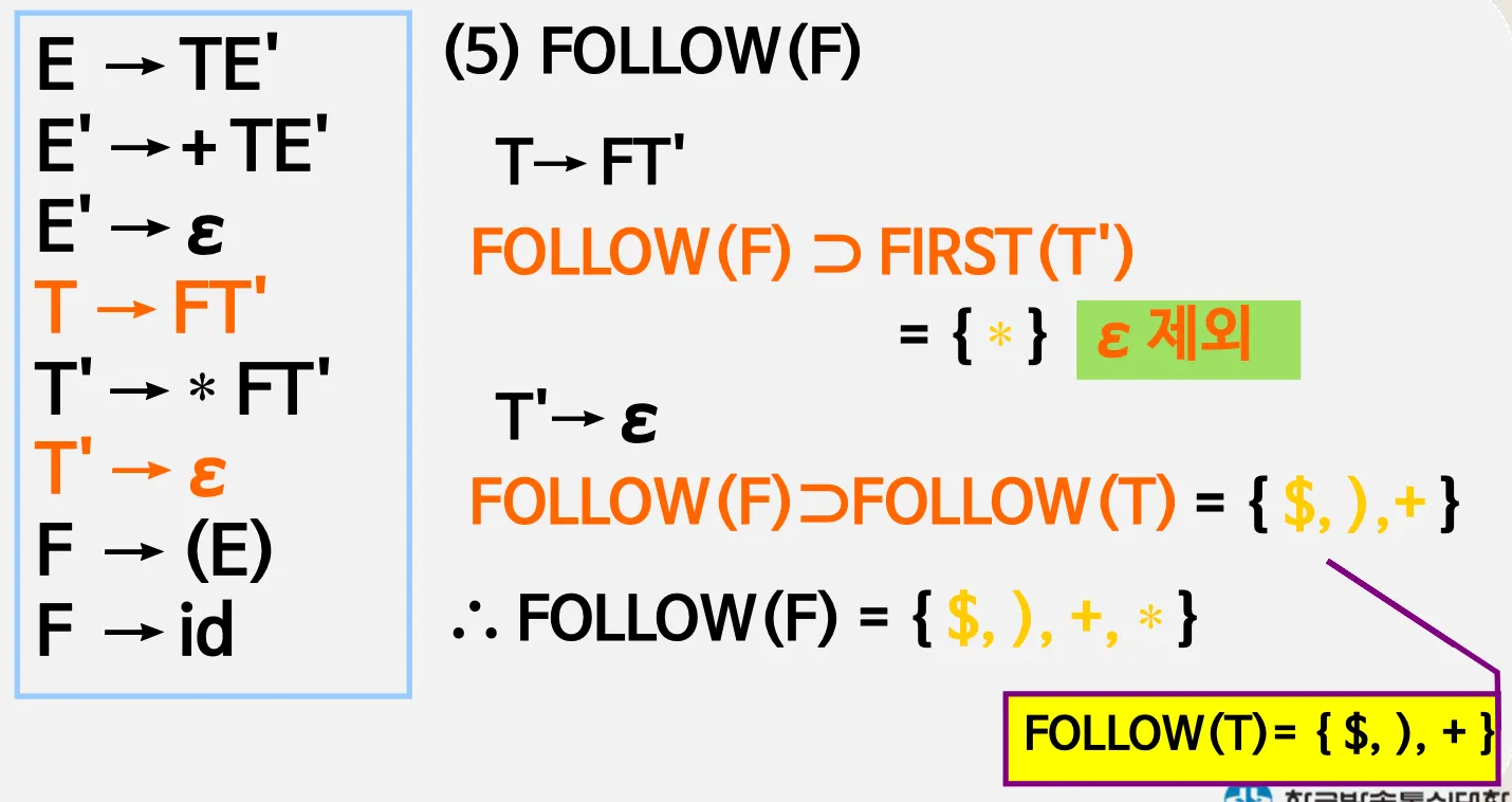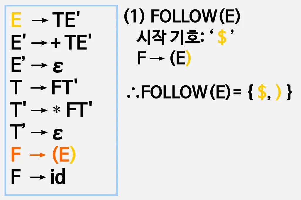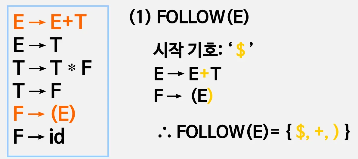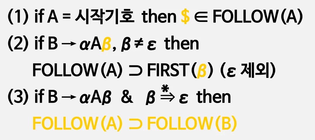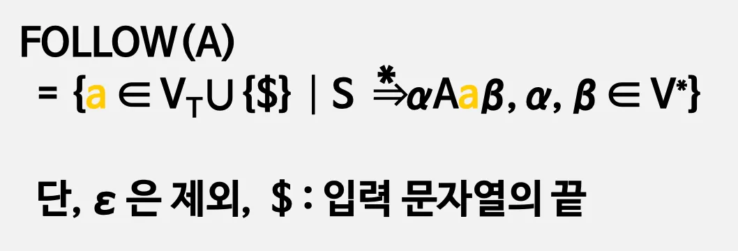 즉, 어떤 문장형태에 있어서, 논터미널 A 다음에 나타나는 터미널 기호들의 집합이다. 여기에서 $기호는 입력 문자열의 끝을 나타내는 기호