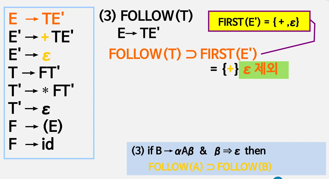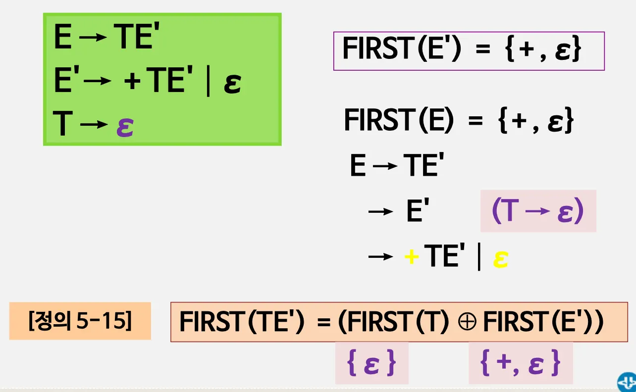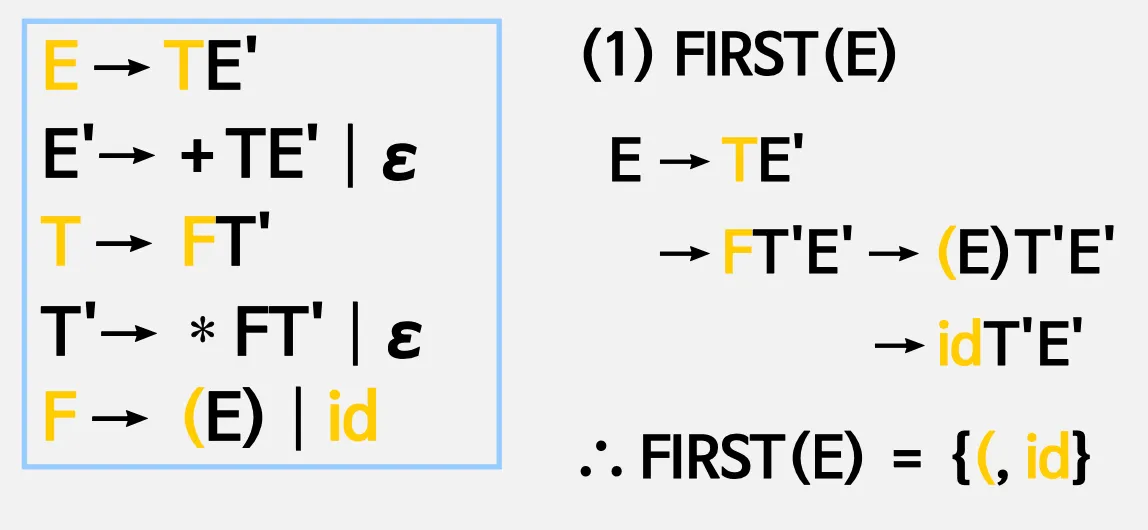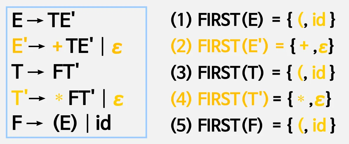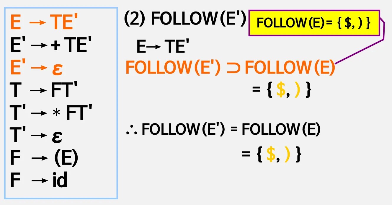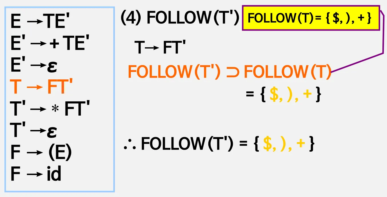 즉, 어떤 문장형태에 있어서, 논터미널 A 다음에 나타나는 터미널 기호들의 집합이다. 여기에서 $기호는 입력 문자열의 끝을 나타내는 기호