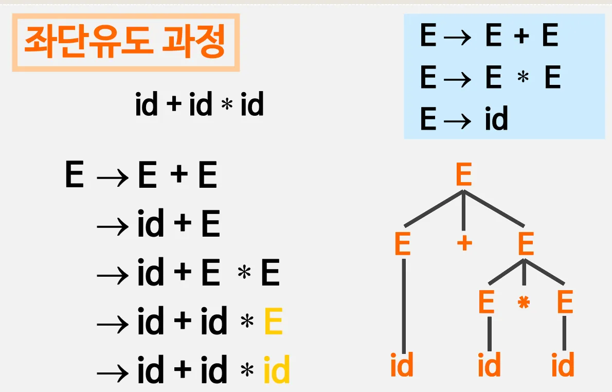 즉, S ⇒ αAw ⇒ αβw의 유도과정이 존재할 때, 문장형태 αβw에서 β를 A로 대체하는 것