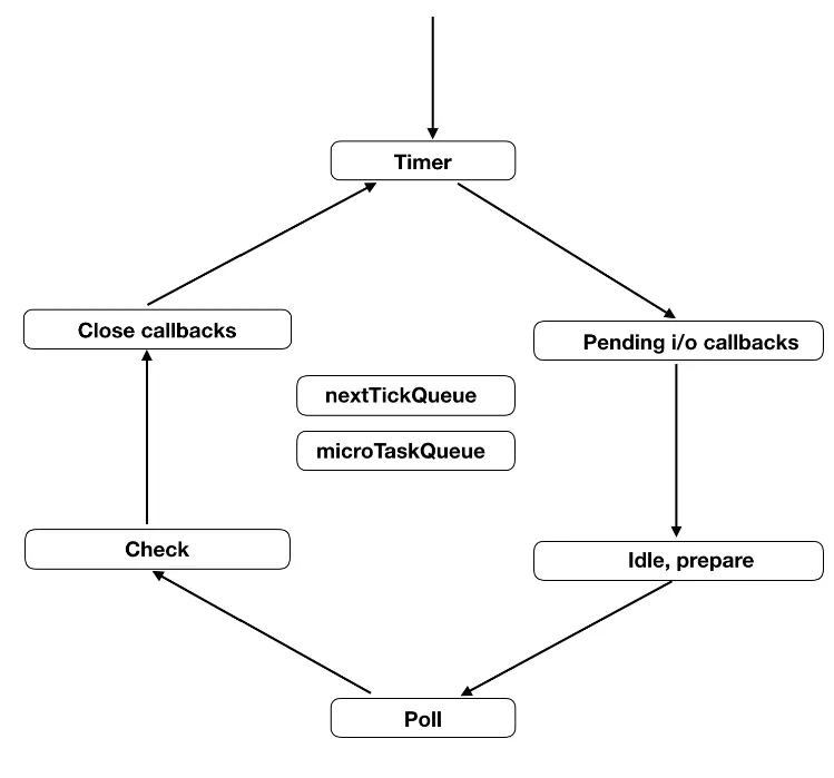 nextTickQueue, microTaskQueue 는, 실제로 루프의 일부가 아니다. 해당 큐 내부의 콜백들은 어느 phase에서든 실행될 수 있으며 가장 높은 우선순위로 실행 된다. (정확히는 특정 phase로 이동할때 동작한다)