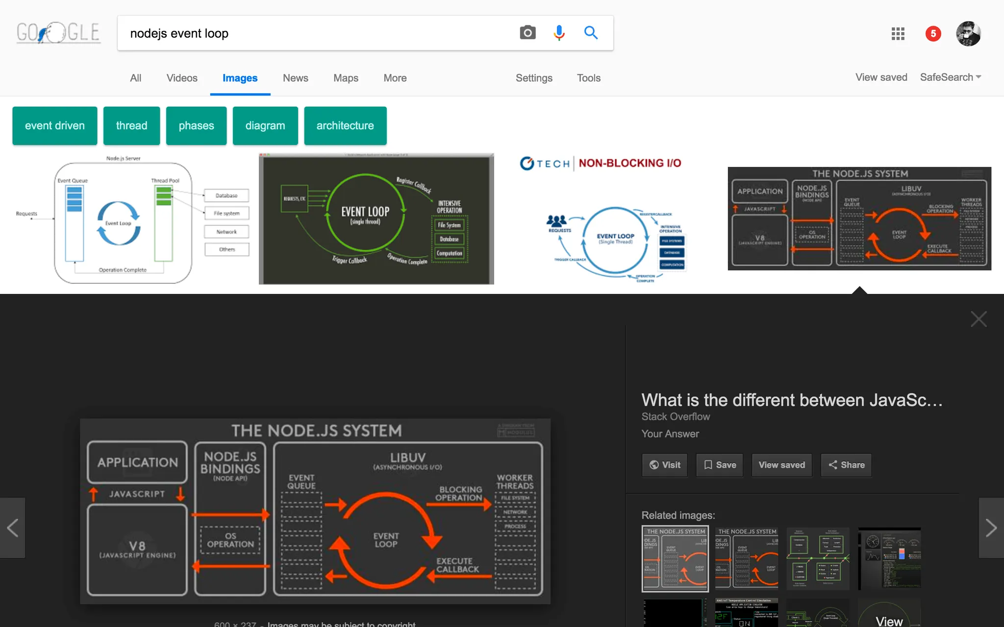 아래 그림은 node.js event loop 를 구글링했을 때 나온 결과를 캡쳐한 것이다. 대부분의 이미지 검색 결과는 잘못되었거나, 이벤트루프의 고수준의 view만 보여주고 있다. 이러한 종류의 description 때문에 많은 개발자들이 이벤트루프에 대해 잘못된 이해와 오해를 갖고 있다. 아래에서 개발자들이 흔하게 갖고 있는 오해들에 대해 알아보도록 하자.