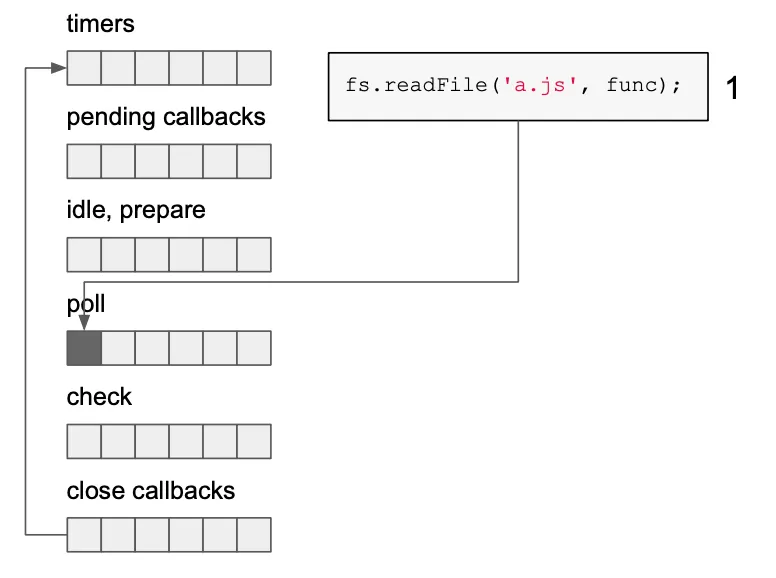poll phase에서 fs.readFile 함수가 호출된다. (libUV 가 커널에 비동기로 처리 요청)