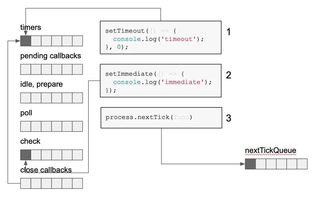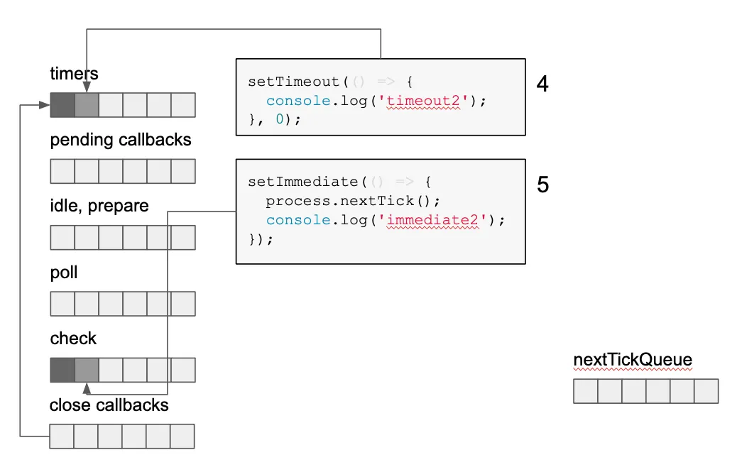 process.nextTick()의 콜백인 setTimeout, setImmediate이 각각 timer queue, check queue에 등록된다.