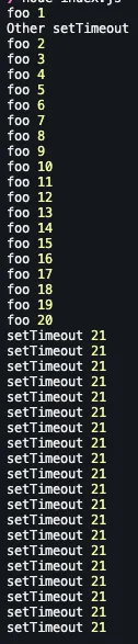 위 함수의 실행시키면, foo 들이 먼저 출력될 것이고, 그다음에 setTimeout 들이 출력될 것이다. 코드를 실행시키면 setTimeout 의 delta 값인 2ms가 지나고나면 foo 함수가 실행되어 첫번째 foo 가 출력되고, nextTickQueue에서 다시 foo 함수가 호출된다. nextTickQueue 의 콜백들은 큐가 빌때까지 순차적으로 (동기식으로) 처리한다. 따라서 nextTickQueue의 모든 콜백이 실행된 다음에 timer phase에서 setTimeout 콜백이 처리된다.