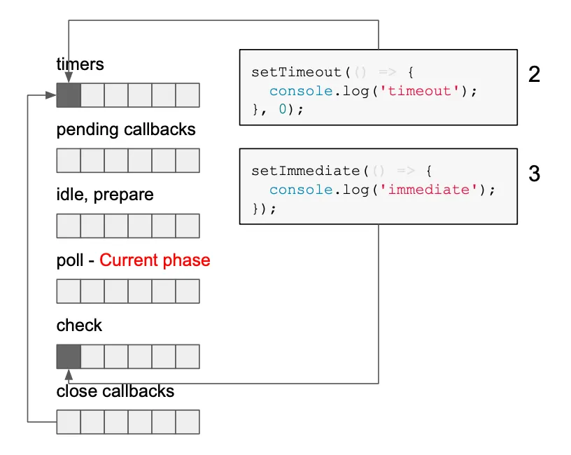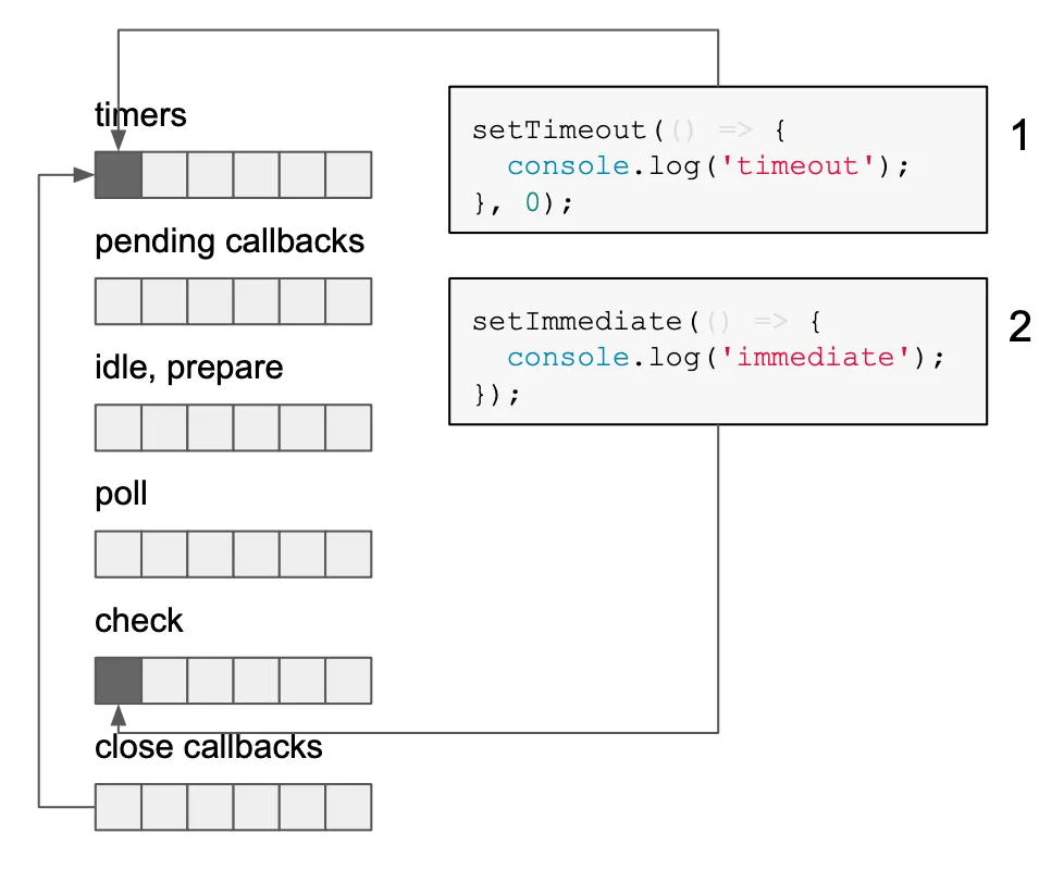 이와 반대로 setImmdiate 의 경우 타이머의 delta값을 비교하는 등의 과정이 필요하지 않기때문에 빠르다. 또한 setImmdiate 는 poll phaase 바로 다음에 실행되기 때문에, setImmdiate 콜백은 새로운 요청 직후 바로 실행된다고 볼 수 있다.